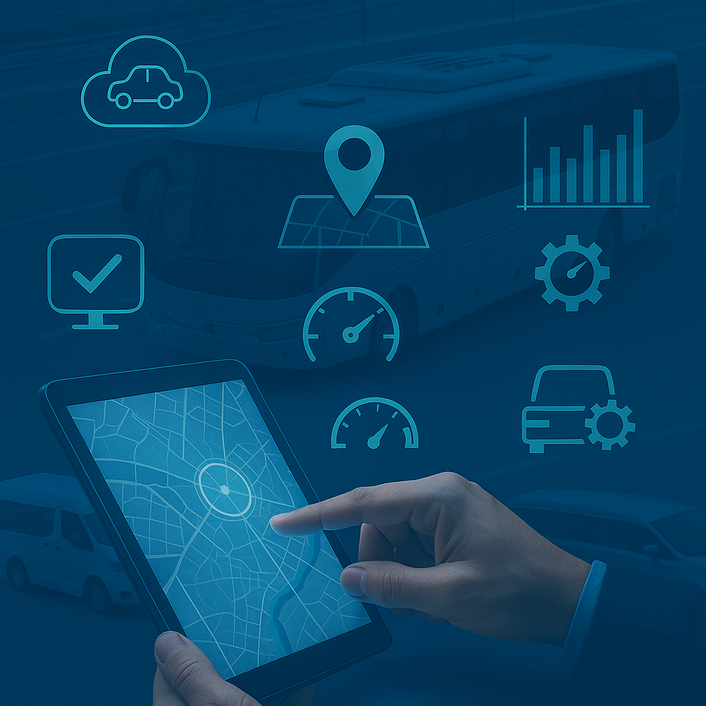A diverse, technology-driven fleet of modern buses, sedans, and luxury vehicles.